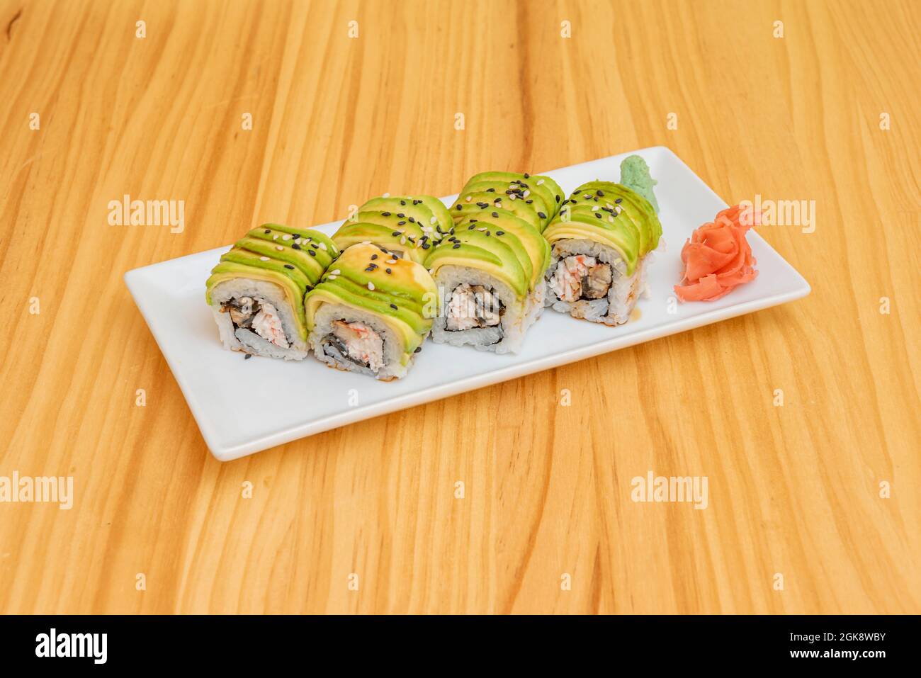 Uramaki Dragon Roll With Wasabi And Ginseng With Avocado Slices On Top Stuffed With Eel And Cheese With Sesame And Poppy Seeds Stock Photo Alamy